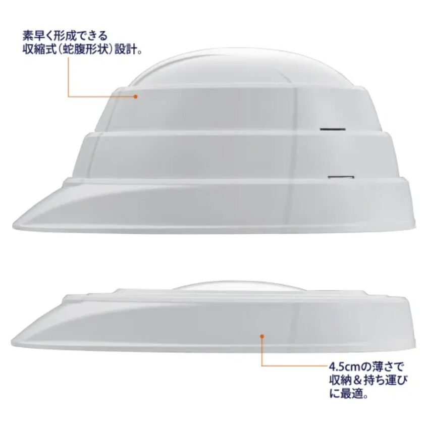 使用時は「被る動作」でヘルメットにトランスフォーム!備蓄時に場所をとらないのはもちろん、デスク周りに備えておいても邪魔になりません。また、コンパクトであるため携行性にも優れており、現場活動時の要救助者用ヘルメットや、公共交通機関を利用してボランティア活動へ参加する際のPPEにも最適です。