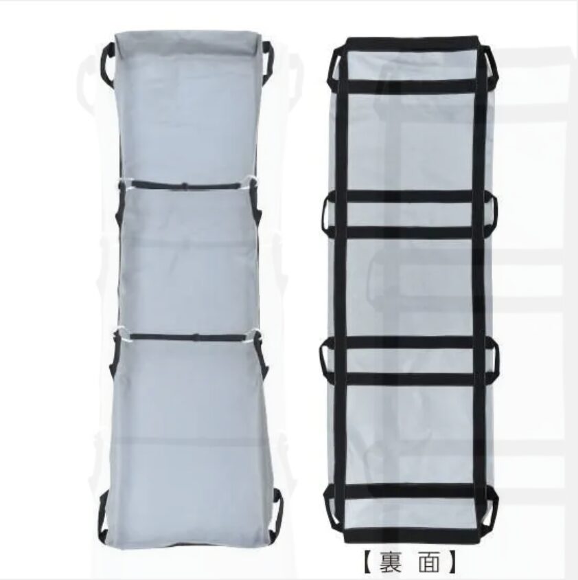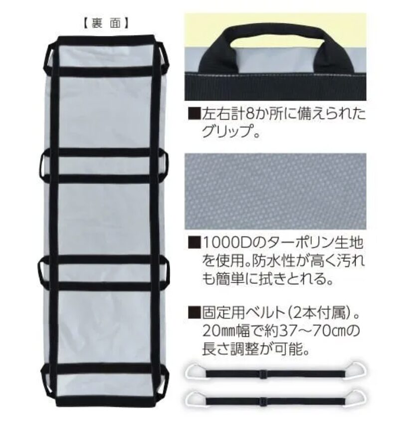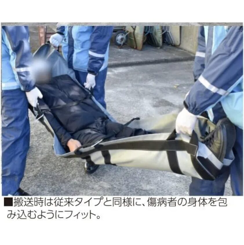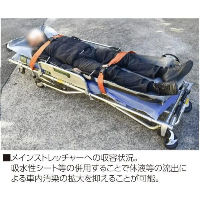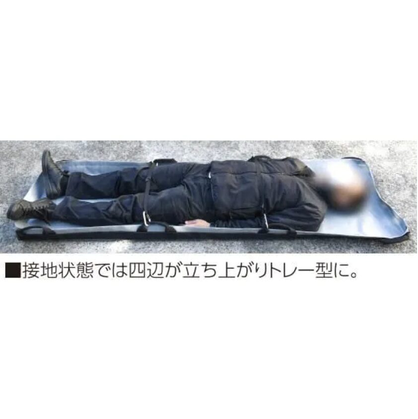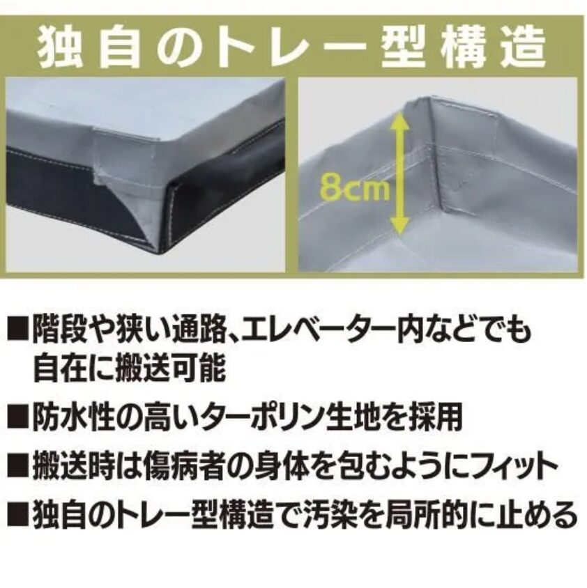 骨組みがなく生地でできた簡易担架は、階段や狭い通路といった場所での搬送に活用されます。最近ではターポリン生地を用いたものが普及していますが、その生地特性を活かし、新たな機能を持たせたのがトレー型ターポリン担架です。通常の布担架やターポリン担架はフラットタイプですが、この担架は四辺が立ち上がったトレー型が特徴。普段お使いの吸水性シート等と併用することで、傷病者に継続する出血、突然の嘔吐や失禁があった際も汚染を局所的に止めることができます。これにより感染防止を図れるのはもちろん、帰署後の車内清掃を短時間で済ますことができ、すぐに次の出動に備えることができます。