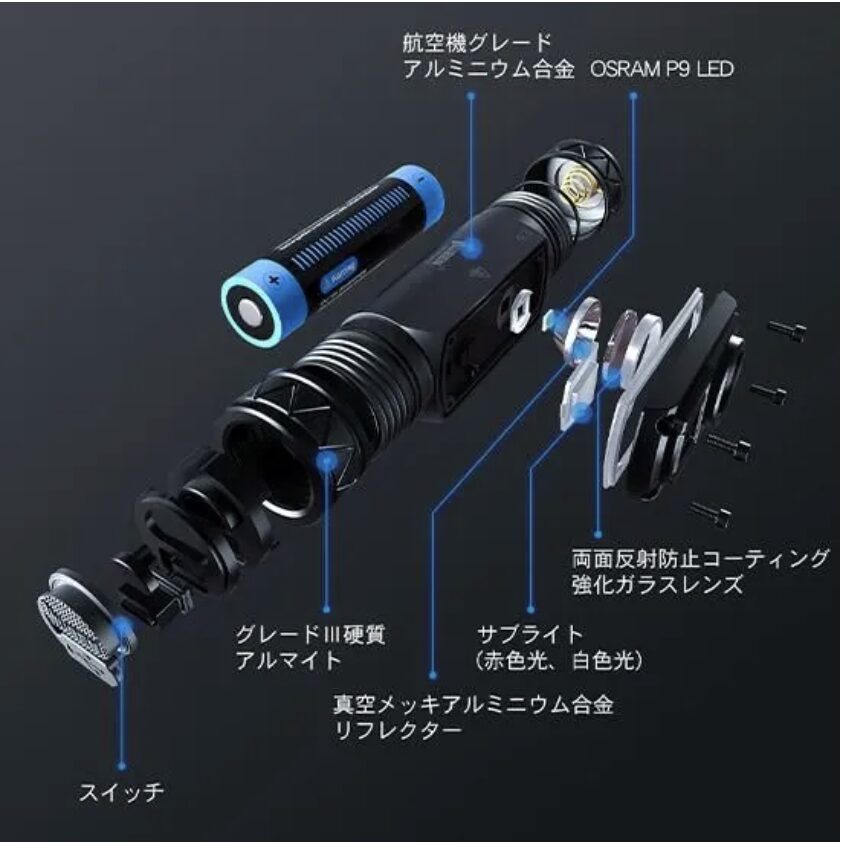 〔実用点灯時間〕Turbo:2時間、High:2.6時間、Med:14時間、Low:500時間、サブライト(白):25時間、サブライト(赤):30時間