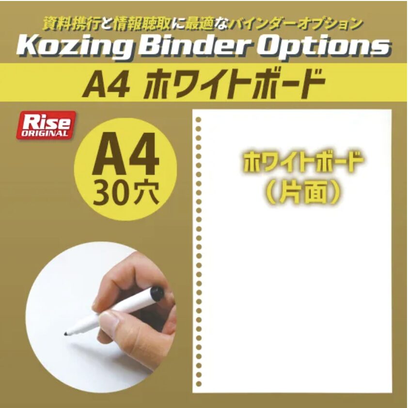 A4 ホワイトボードはA4タイプのKozingバインダーはもちろん、市販の30穴バインダーにもセットが可能だ。