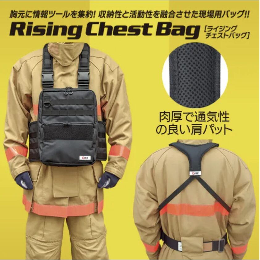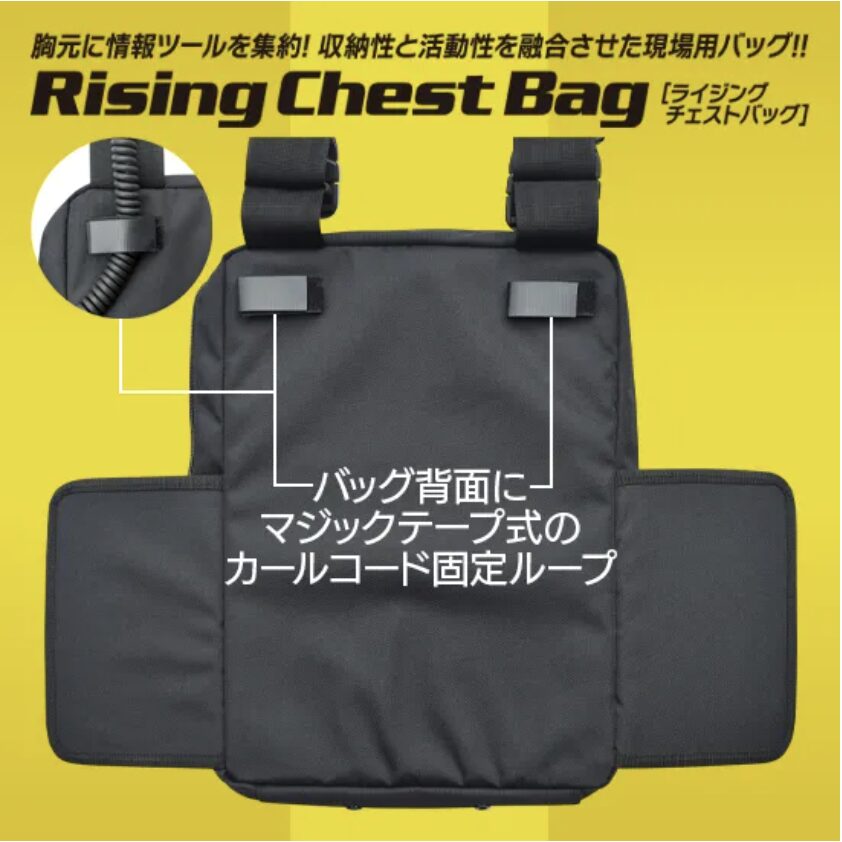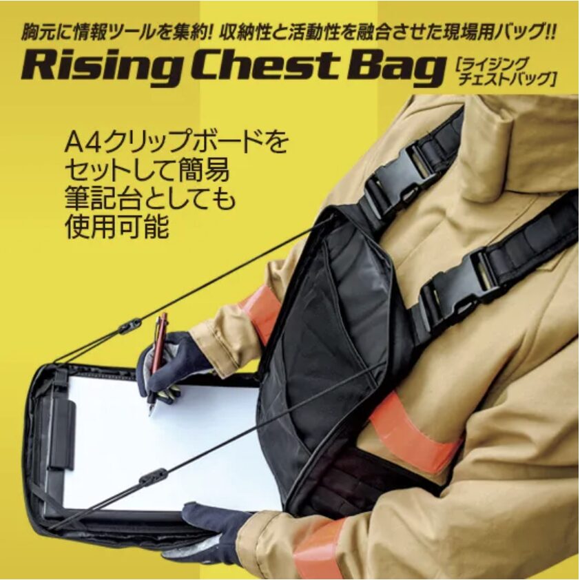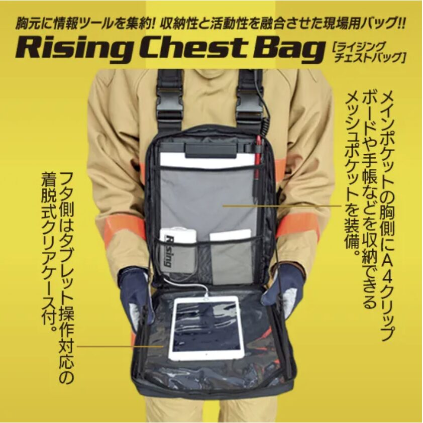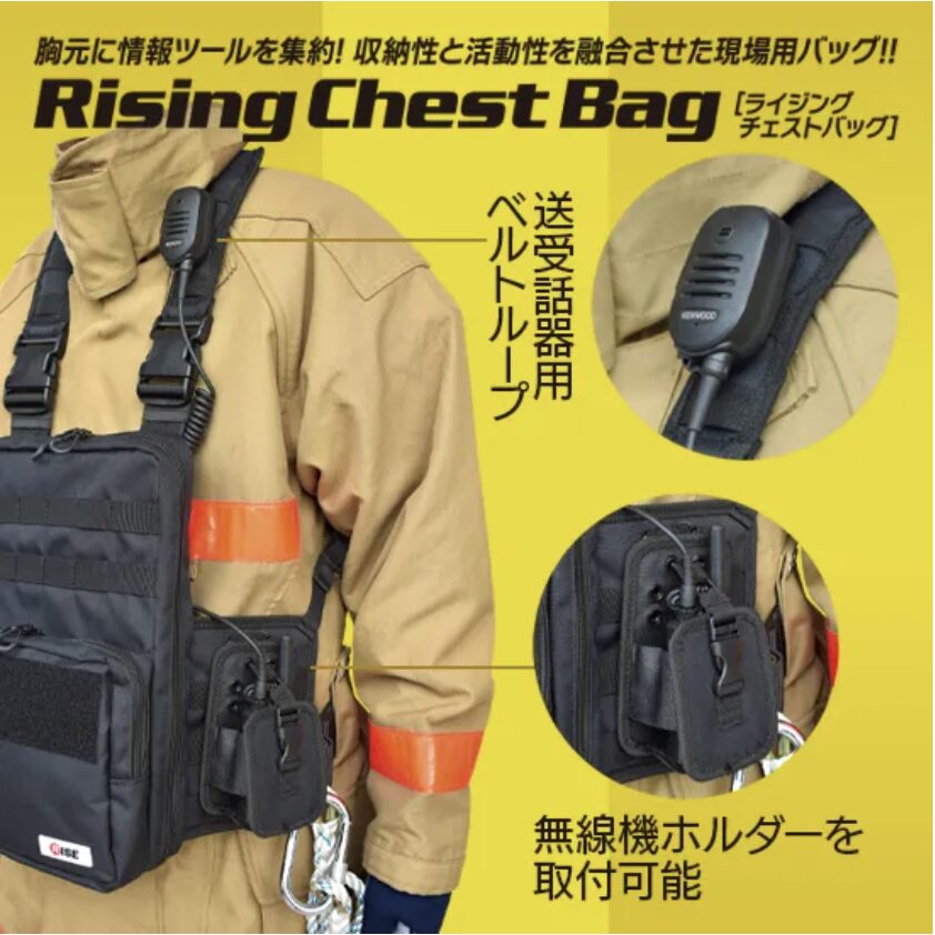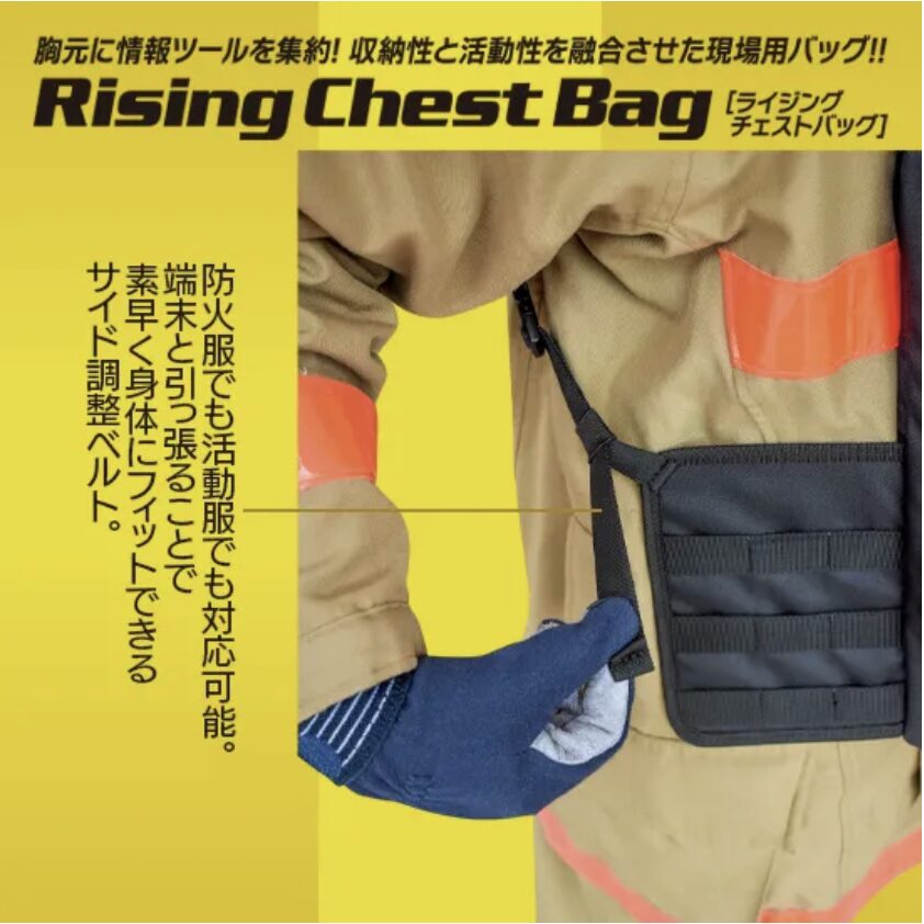 ラジオハーネスでは無線機以外のものが収容しにくく、ベストのようにもう一枚重ね着すると活動性が気になる。そんな現場の声を解消するために開発したのがRisingチェストバッグ。