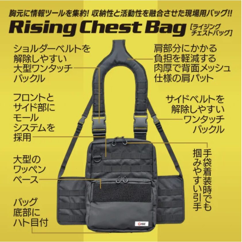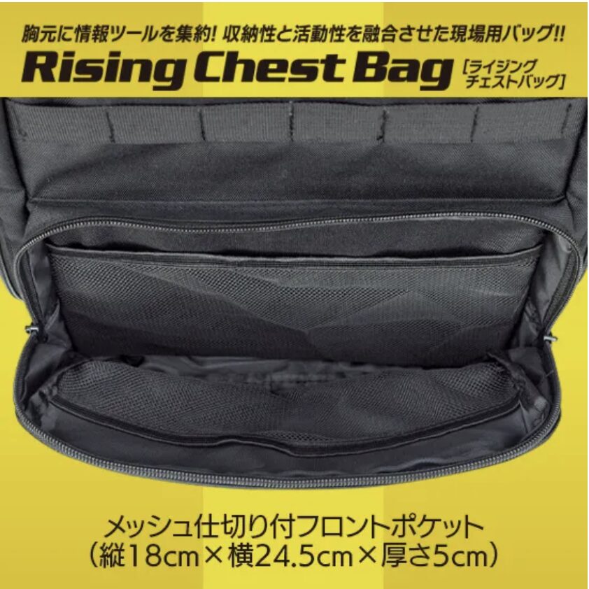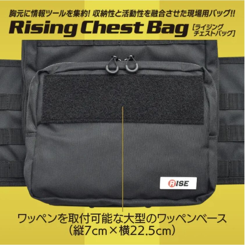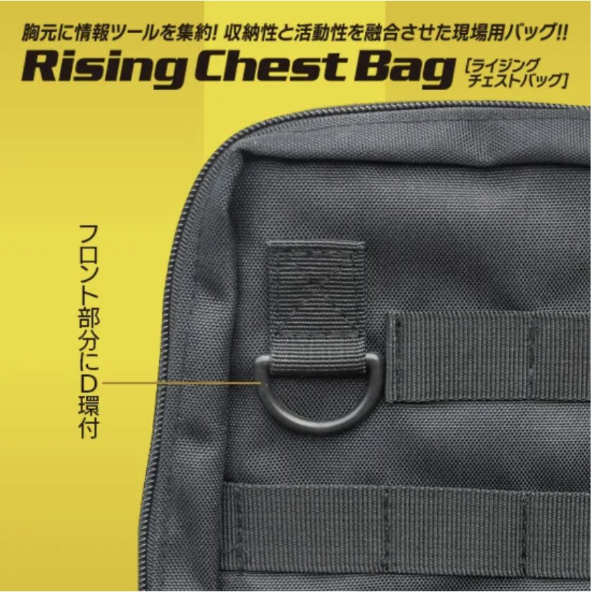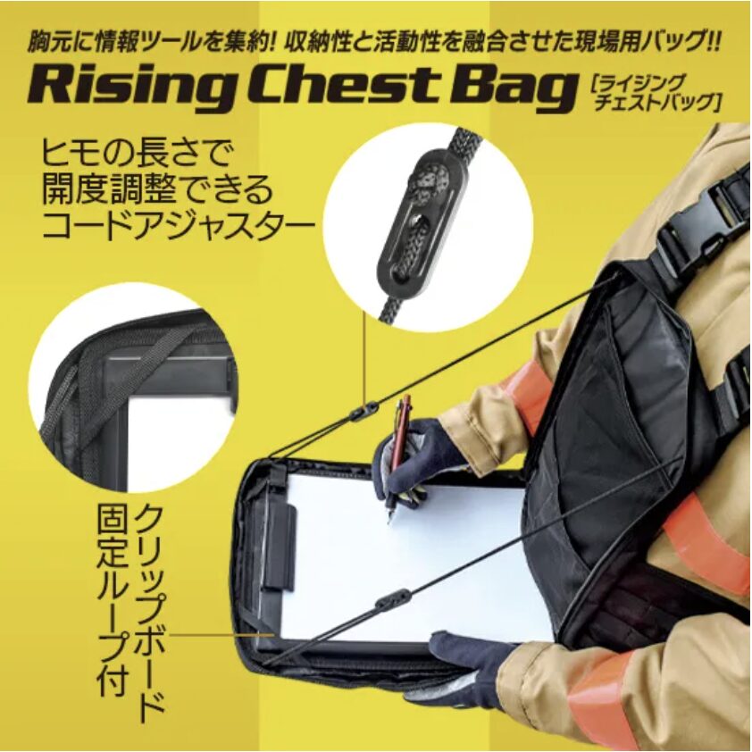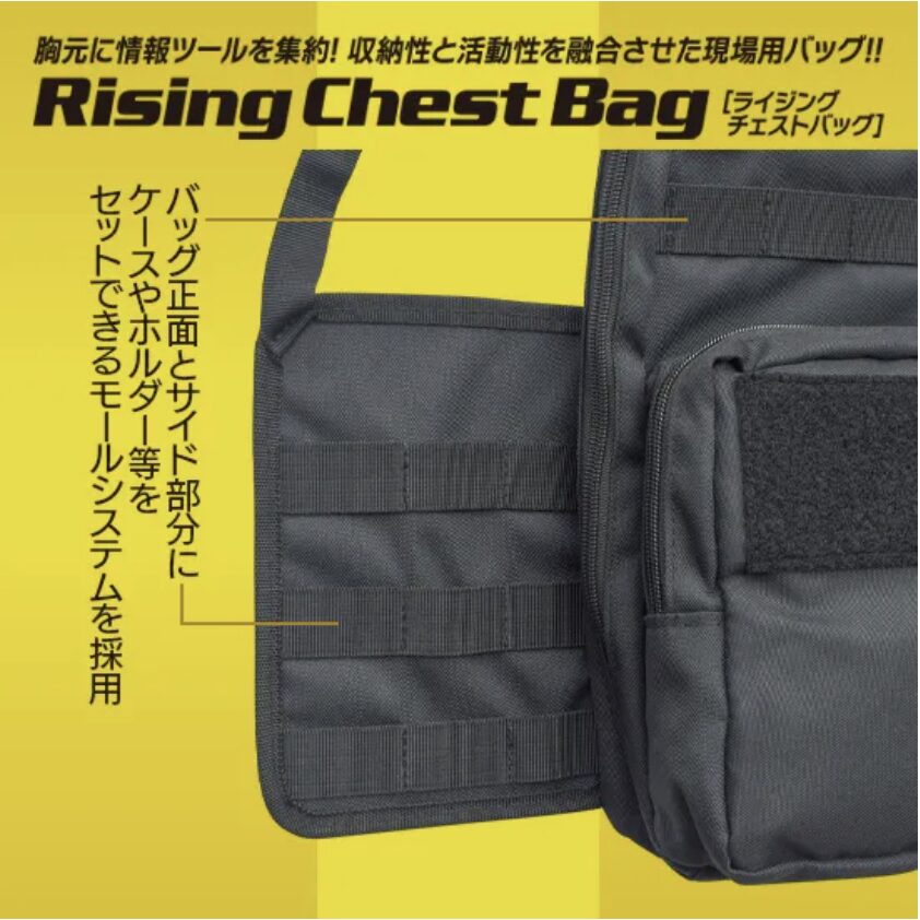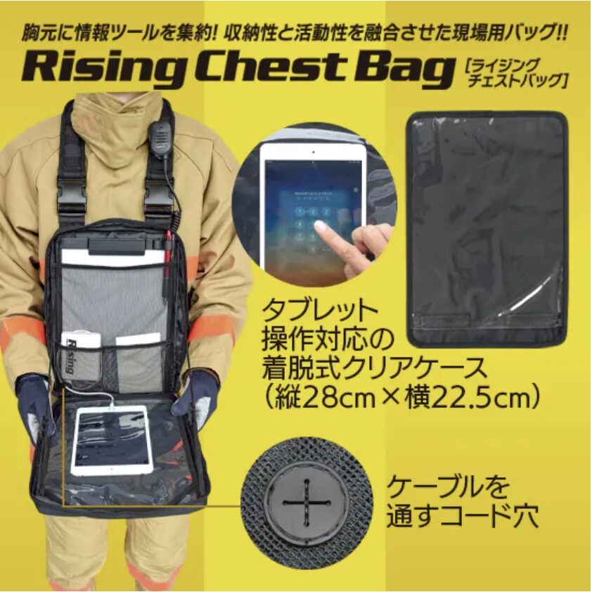 ラジオハーネスでは無線機以外のものが収容しにくく、ベストのようにもう一枚重ね着すると活動性が気になる。そんな現場の声を解消するために開発したのがRisingチェストバッグ。